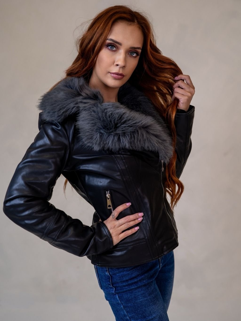 Dámska koženková bunda s kožušinou z novej kolekcie.