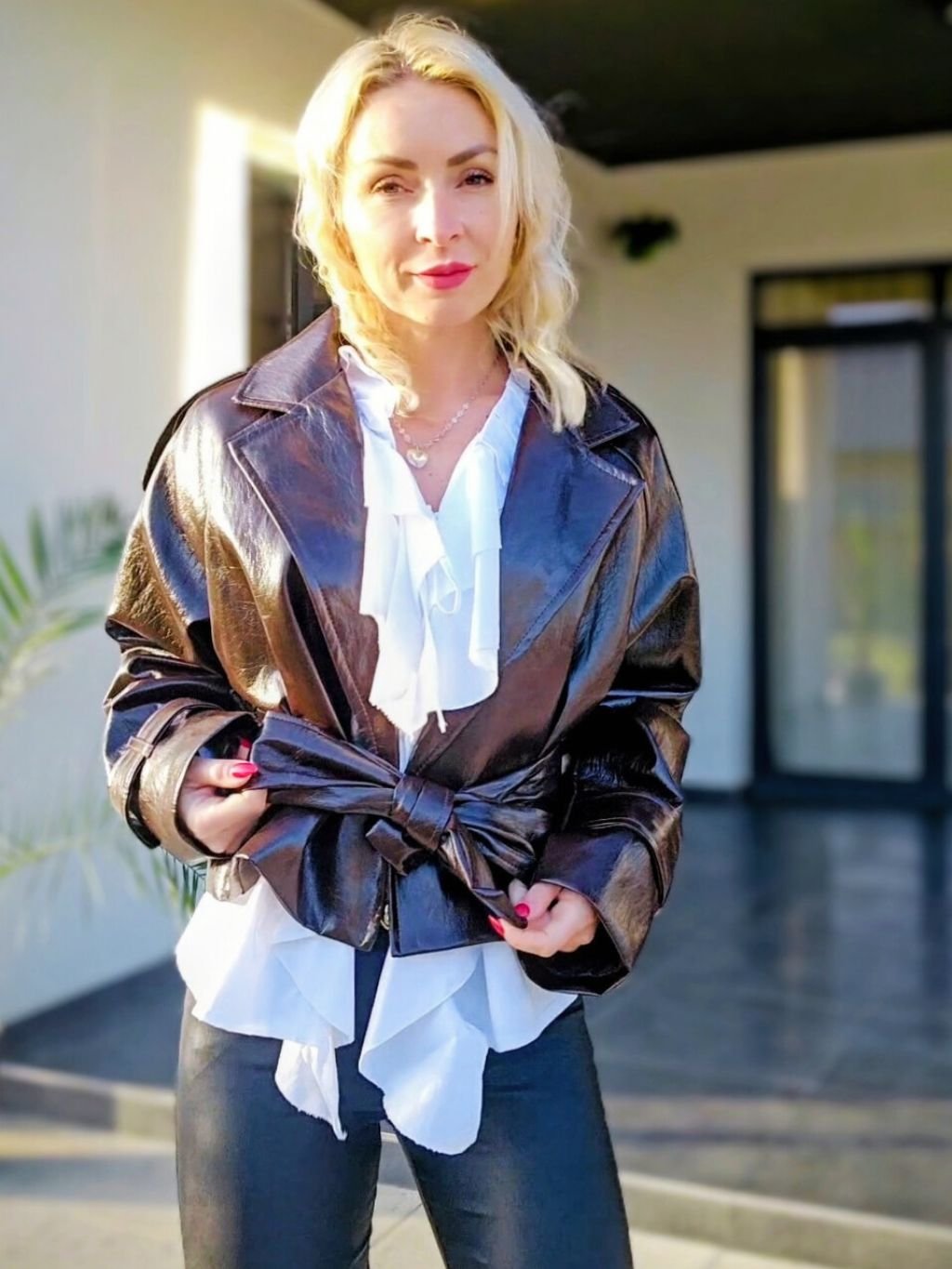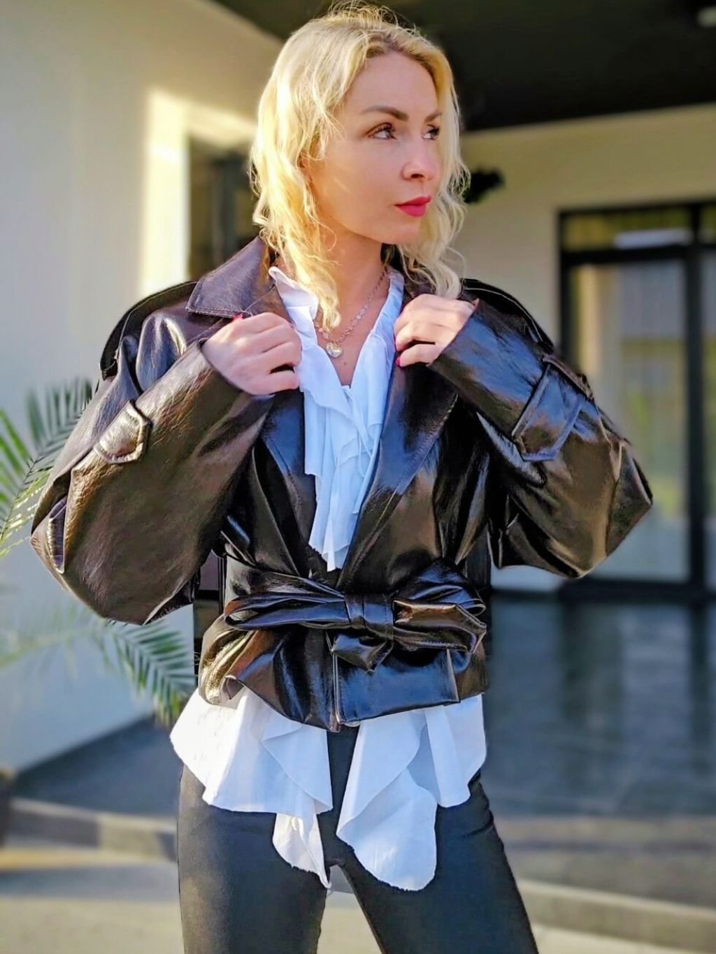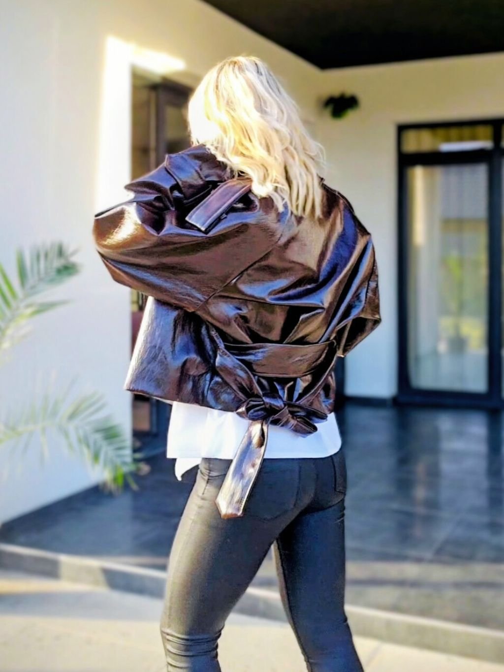 Dámska koženková bunda. Má viazanie v páse, ktoré krásne zvýrazní postavu. Bunda pôsobí štýlovo a je vhodné na každodenné nosenie.