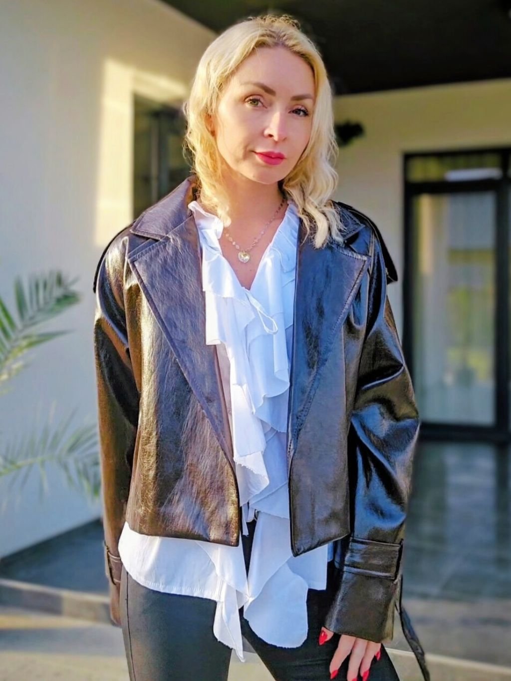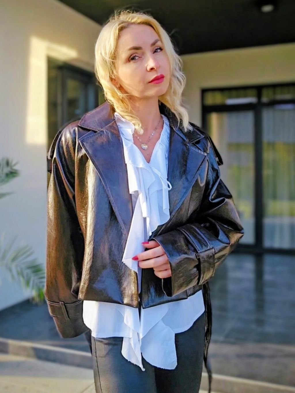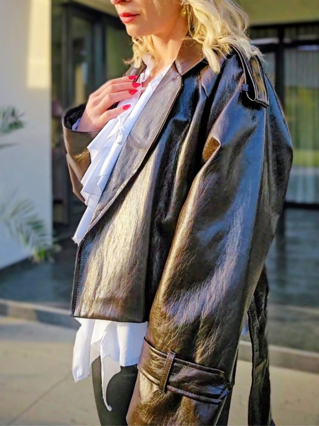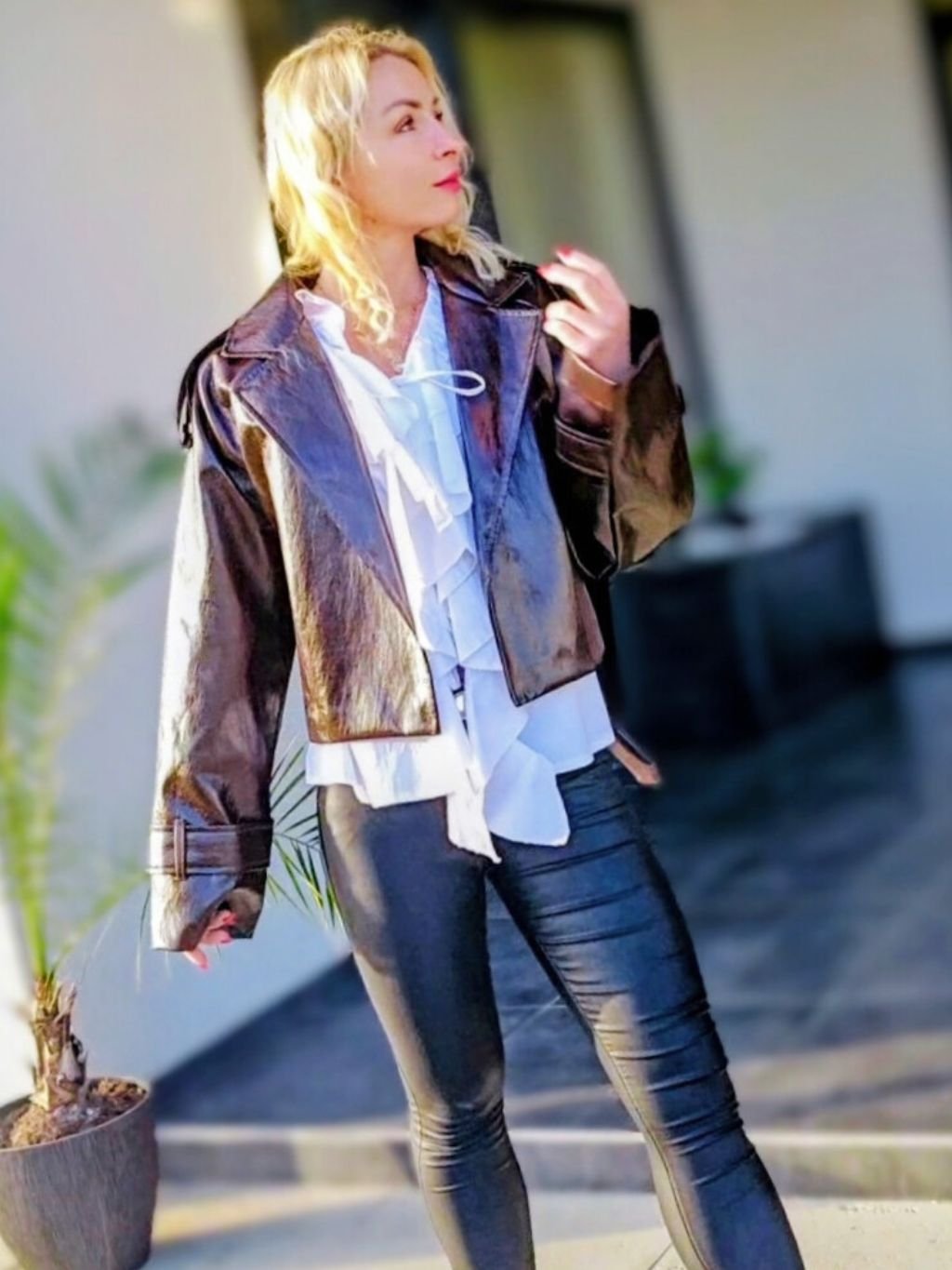 Dámska koženková bunda. Má viazanie v páse, ktoré krásne zvýrazní postavu. Bunda pôsobí štýlovo a je vhodné na každodenné nosenie.