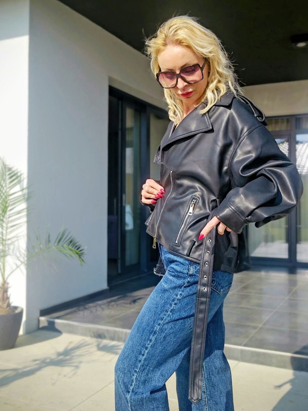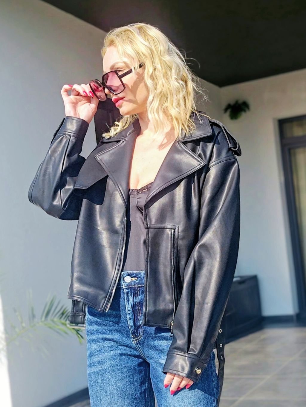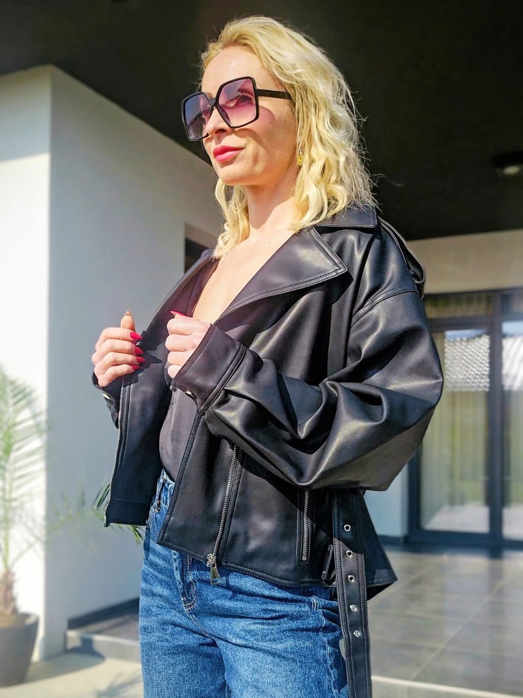 Dámska koženková bunda. Má klasické zapínanie na zips a opasok v páse, ktorý krásne zvýrazní postavu. Bunda pôsobí štýlovo a je vhodné na každodenné nosenie.