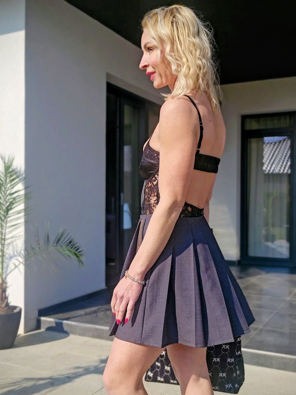 Štýlová šedá plisovaná mini sukňa, ktorá dodá outfitu moderný a mierne rebelský nádych. Sukňa má vysoký pás a výrazné dekoratívne pásiky s kovovými krúžkami, ktoré vytvárajú originálny detail. Vďaka áčkovému strihu krásne zvýrazní postavu. Ideálna na každodenné nosenie, ale aj výraznejšie fashion outfity.