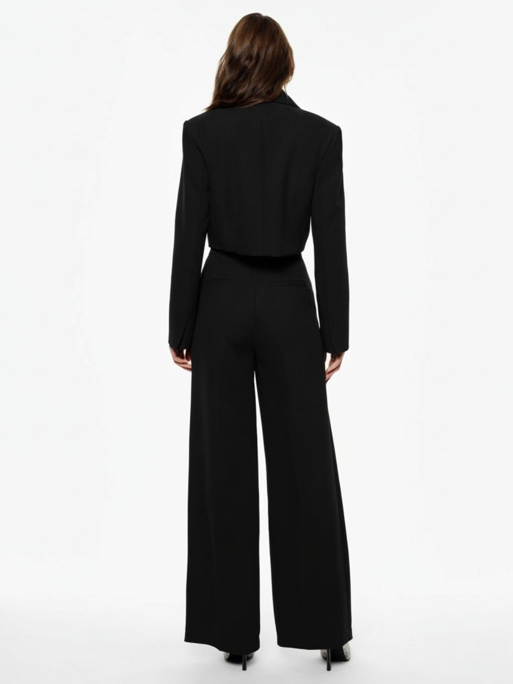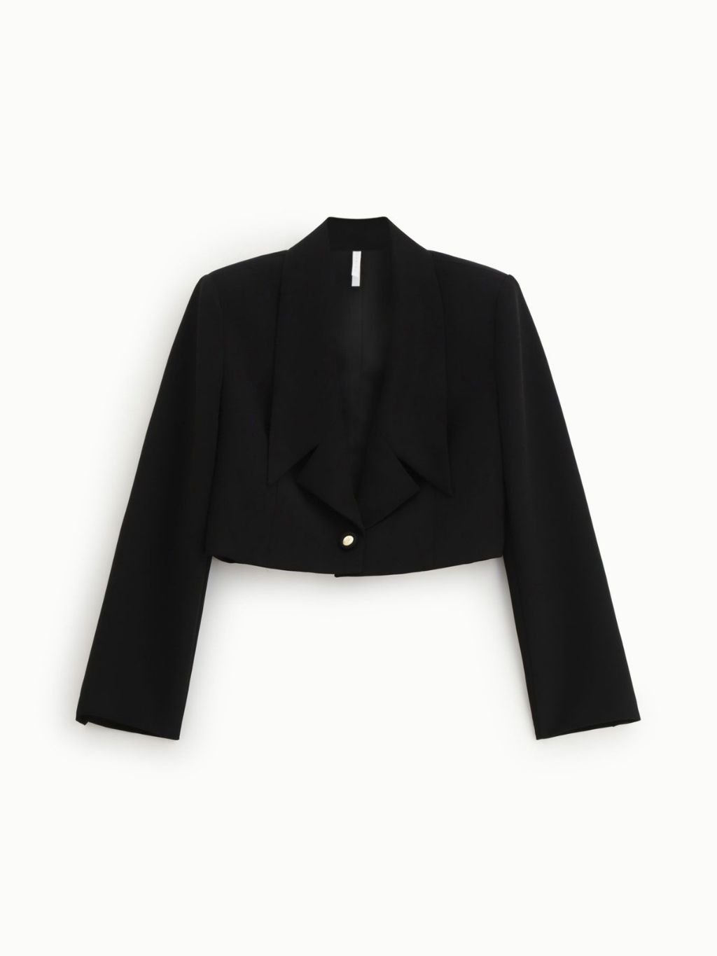 Skrátené sako s jednoradovým zapínaním a výraznými širokými klopami sa vyznačuje ostrými líniami a premysleným strihom. Je určené pre jednotlivcov hľadajúcich elegantný a moderný vzhľad a ponúka všestrannosť pre sofistikované outfity a výrazné módne výrazy.