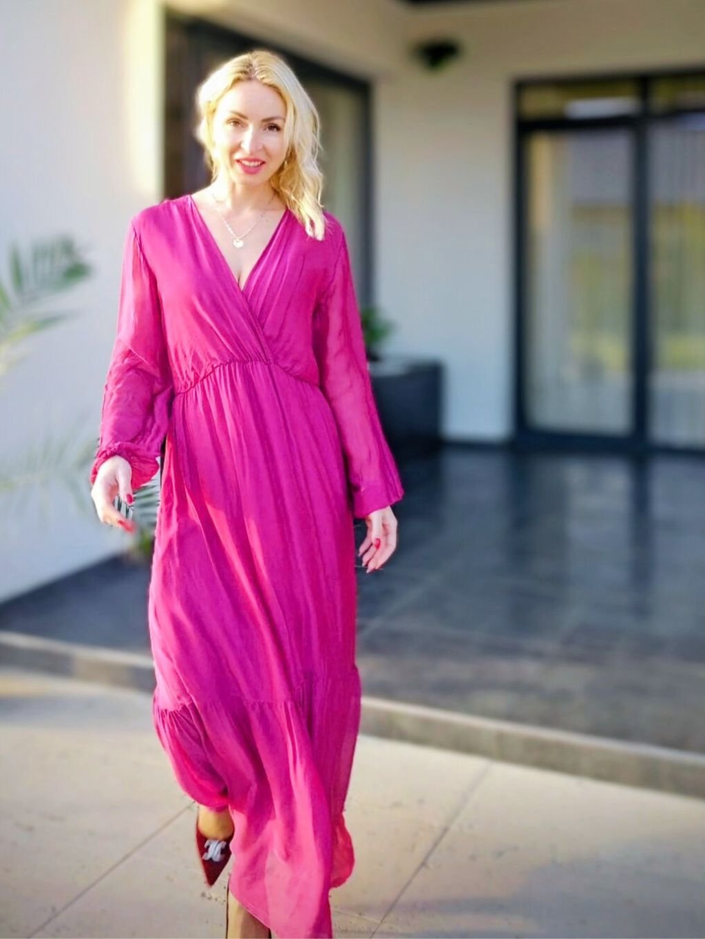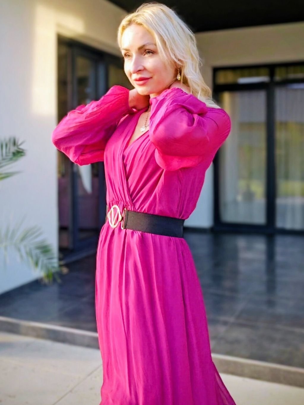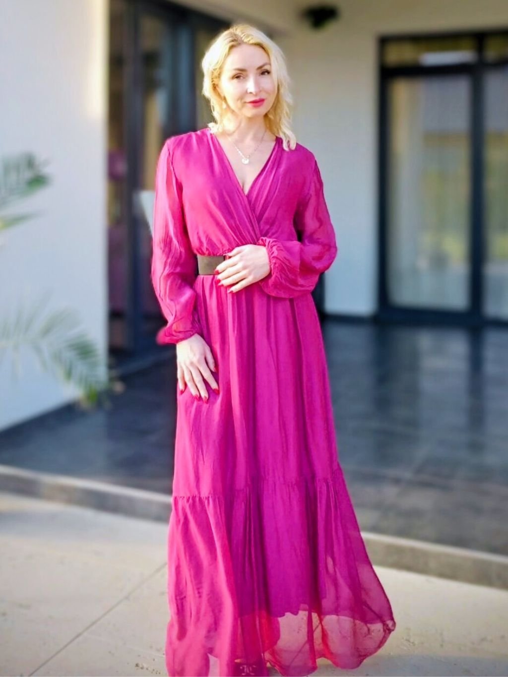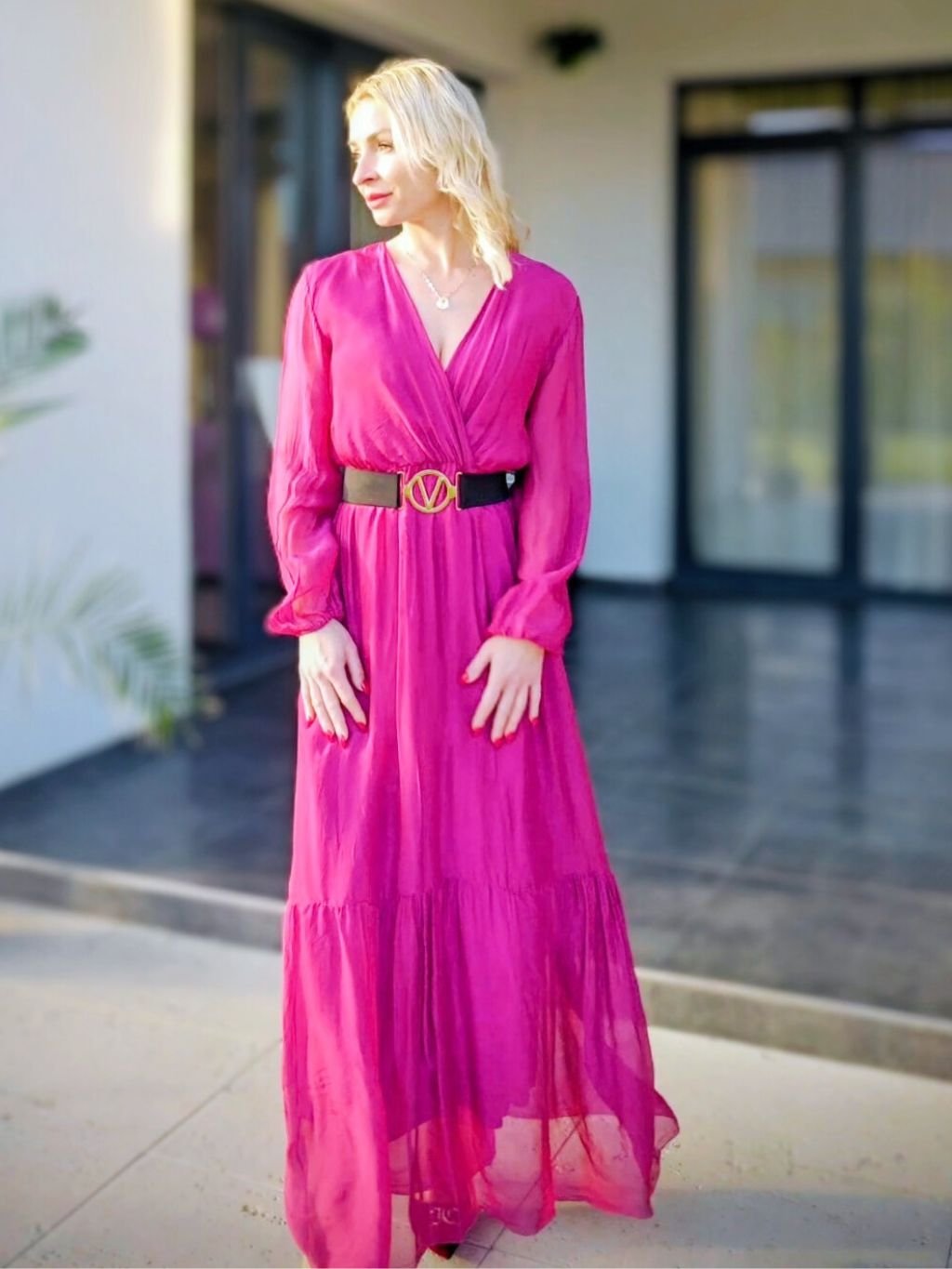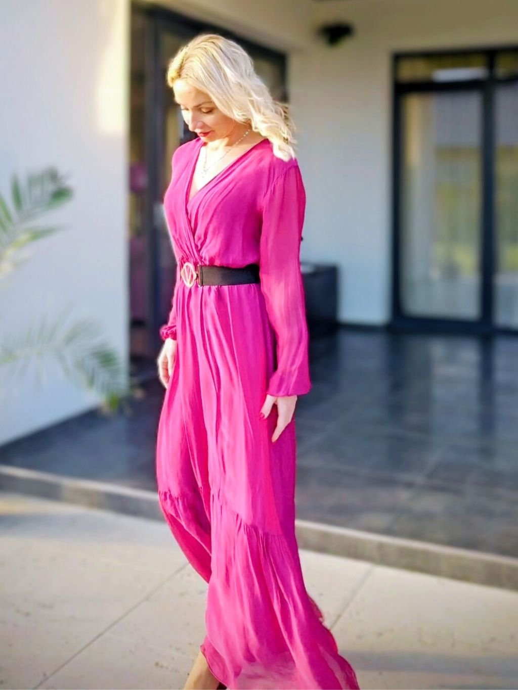 Dámske dlhé letné šaty v krásnej fuksiovej fare. V páse majú gumičku, čo umožňuje a zaručuje pohodlné nosenie počas celého dňa. Sú z príjemného materiálu. Šaty sa predávajú bez opasku. Opasok je možné dokúpiť.