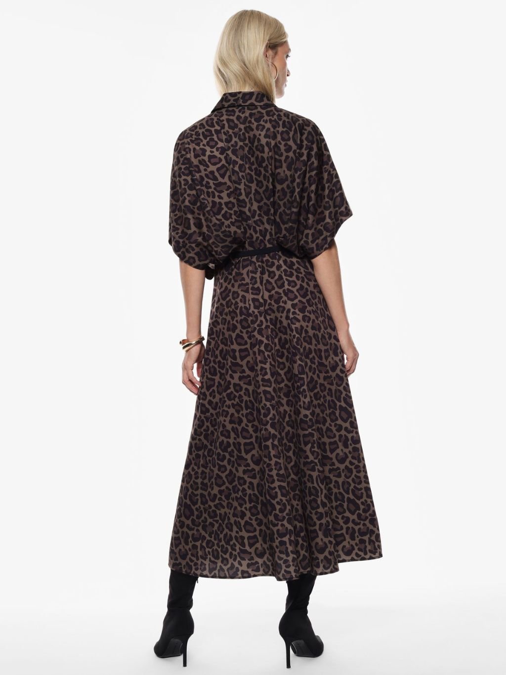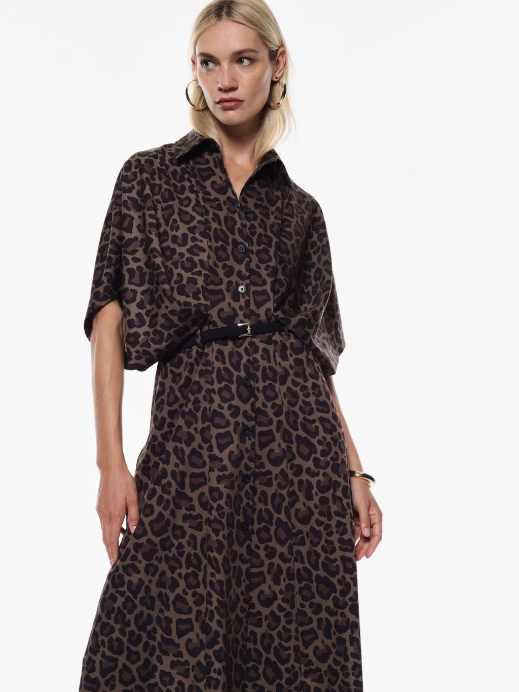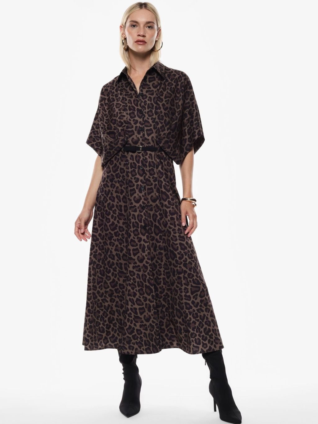 Tieto dlhé šaty vynikajú klasickým golierom a krátkymi rukávmi, ideálne na každodenné nosenie v meste. Široká potlačená sukňa premení každý krok na štýlový zážitok, zatiaľ čo jednoduchý dizajn s gombíkmi dodáva sofistikovanú praktickosť. Ideálne pre tie, ktoré hľadajú rovnováhu medzi eleganciou a pohodlím pri každodenných príležitostiach.