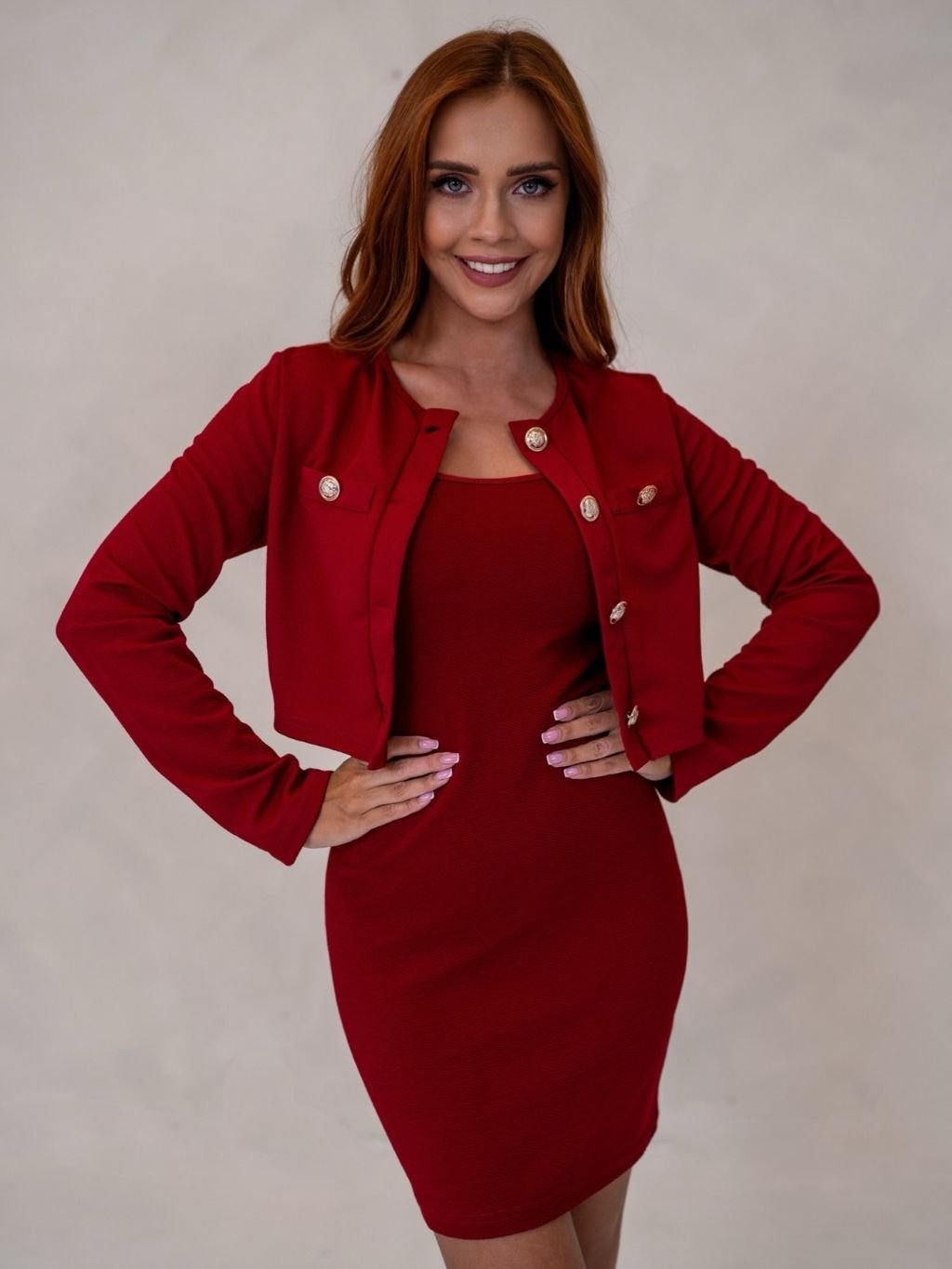 Dámsky komplet z novej kolekcie. Komplet sa skladá zo šiat a saka.