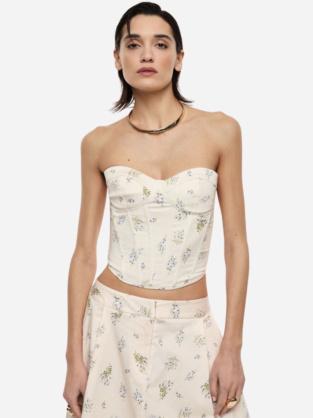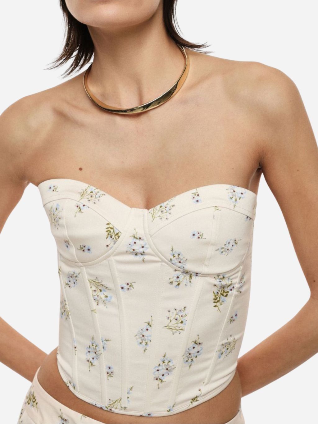 Elegantný korzetový top bez ramienok s jemným kvetinovým vzorom pôsobí žensky a sofistikovane. Tvarovaný strih krásne zvýrazní siluetu a vytvorí moderný, minimalistický look. Top je súčasťou kolekcie, v ktorej nájdeš aj ladiacu sukňu a sako, vďaka čomu si môžeš vytvoriť dokonalý komplet na špeciálne príležitosti aj štýlové mestské outfity.