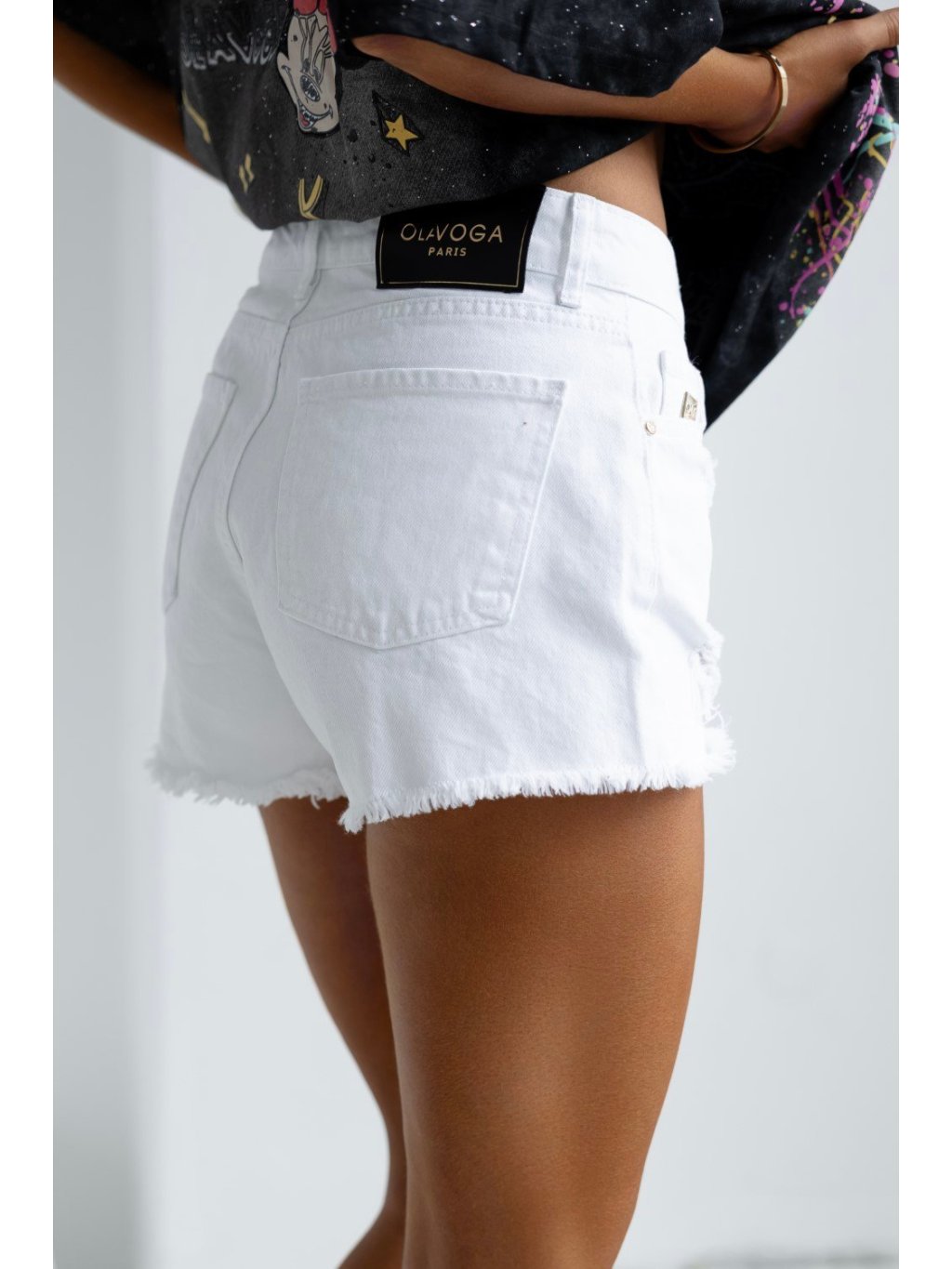 Modelka má výšku 165 cm a nosí veľkosť S. Džínsové šortky s vysokým pásom vyrobené zo 100 % bavlny. Vrecká vpredu a vzadu. Nohavice sú zdobené zubatým okrajom a po celom povrchu efektom opotrebovania. Na prednej strane je minimalistické zlaté logo OLAVOGA a na zadnej strane kožená etiketa s logom. Celkový efekt dotvára gombík s logom v páse.