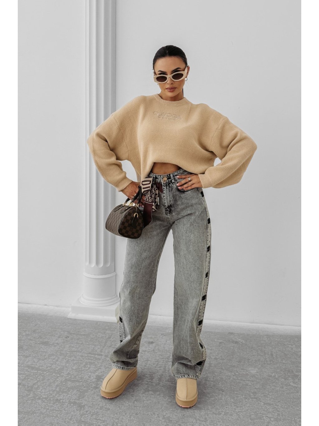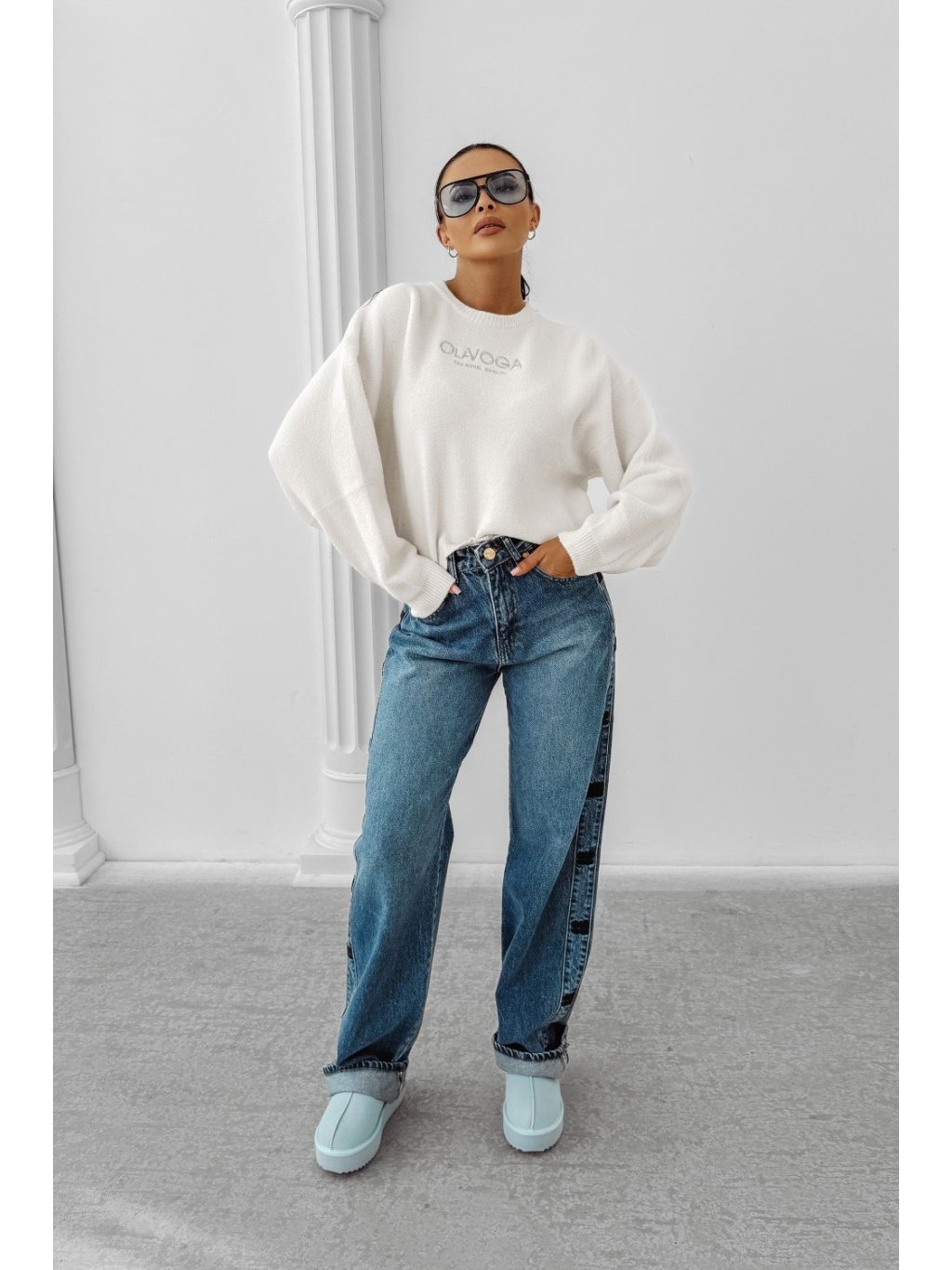 Voľný, mierne oversized sveter, ktorý vďaka klasickému strihu a výstrihu do V pristane všetkým postavám. Vyrobený z mäkkého úpletu s vyšívaným logom na prednej strane. Ideálny pre každodennú eleganciu.