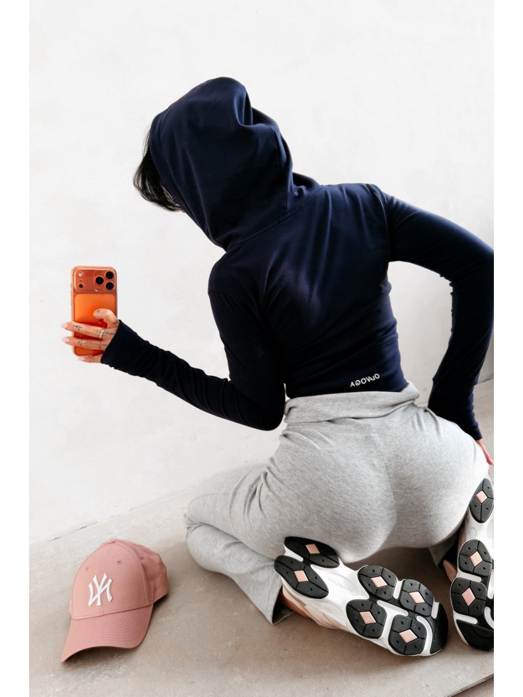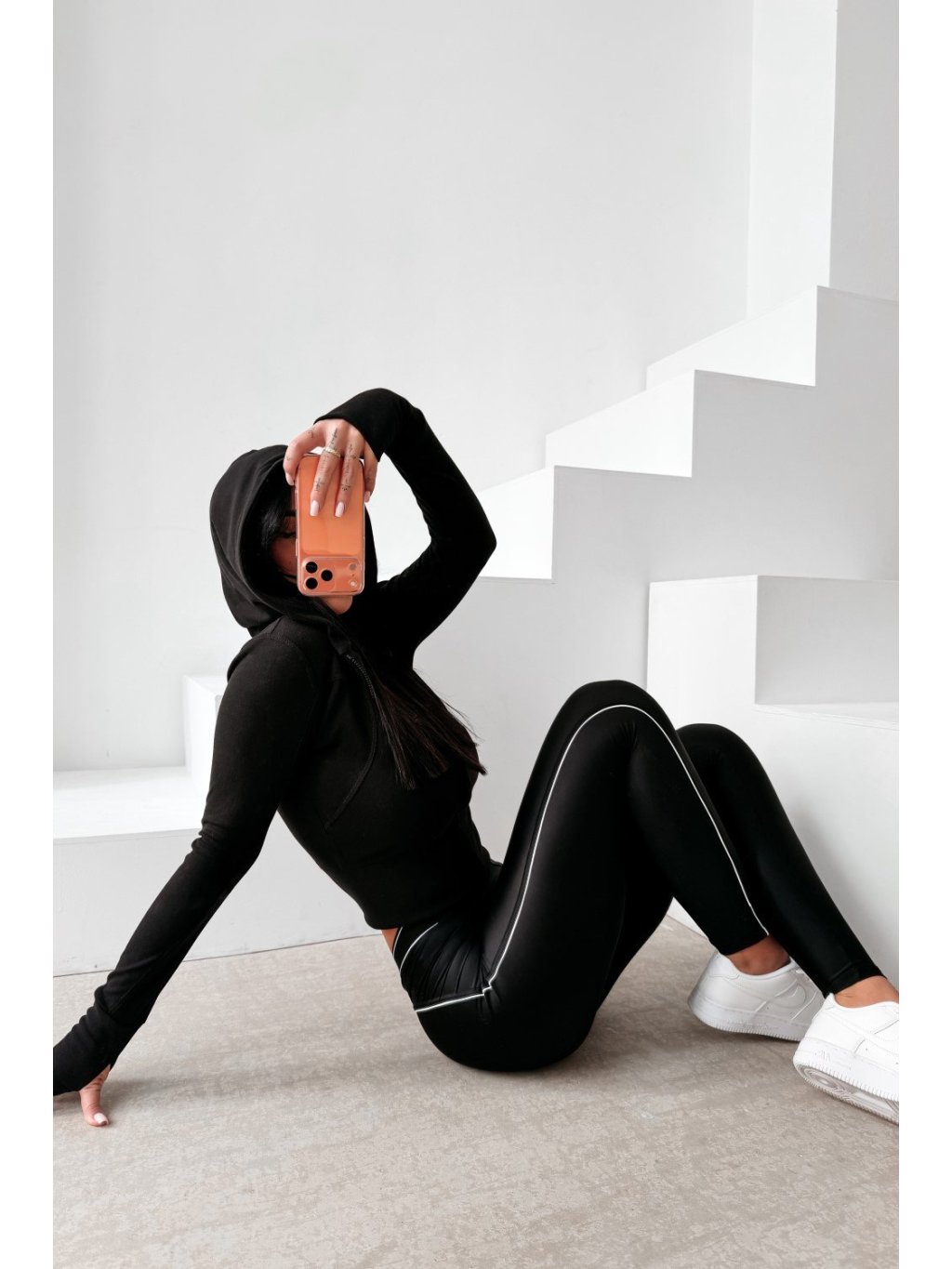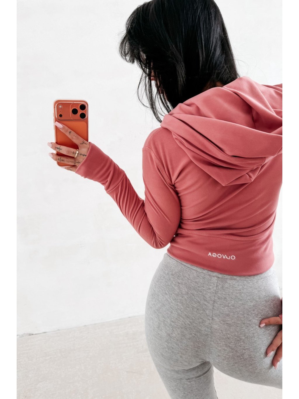 Priliehavá mikina s kapucňou na zips s predĺženým strihom. Vyrobená z kvalitného, elastického a príjemného na dotyk materiálu. Model je zdobený efektnými švami, ktoré opticky zoštíhľujú postavu. Na rukávoch sú pútka na palce. Chrbát je zdobený minimalistickým logom OLAVOGA.