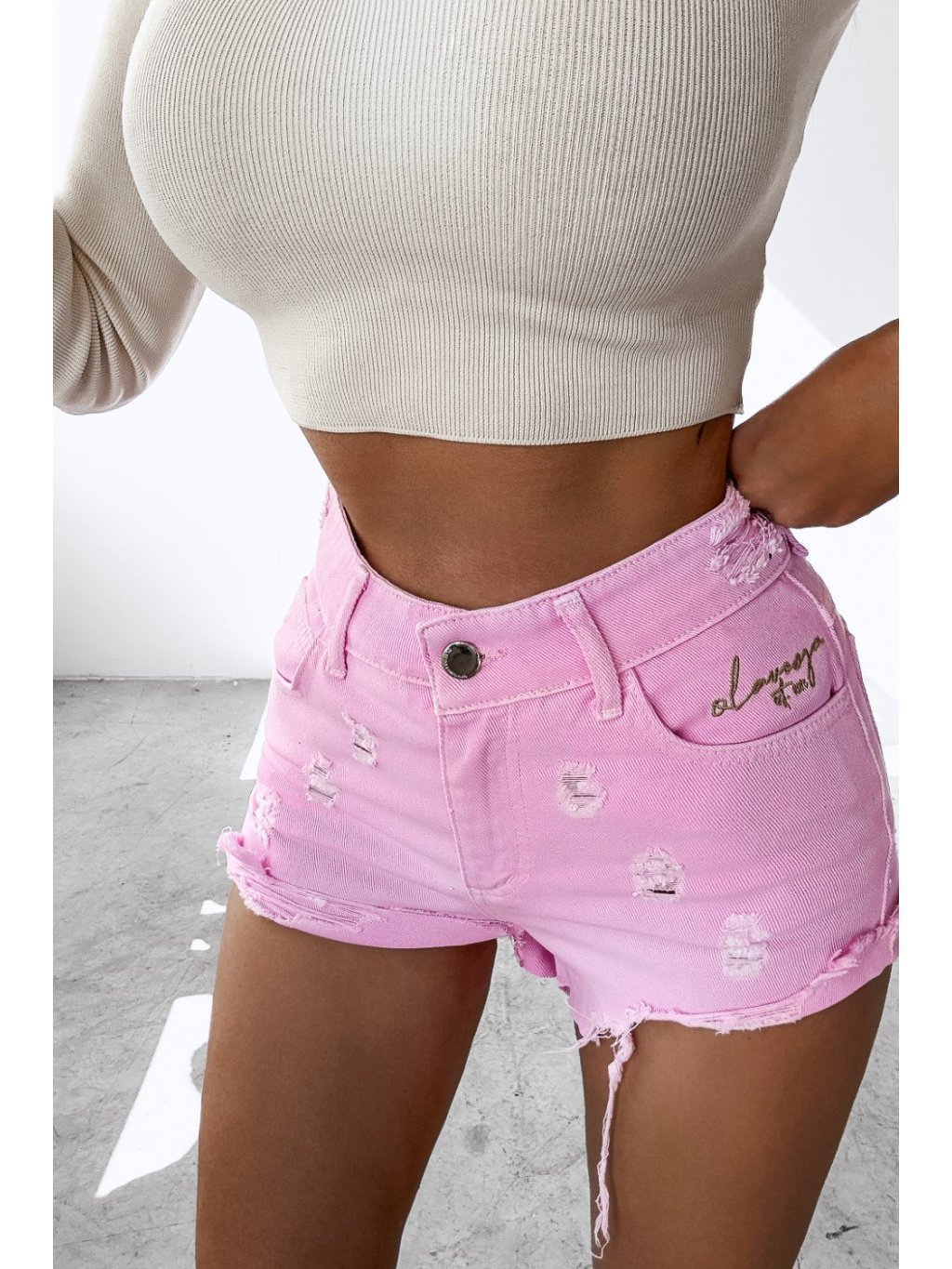 Modelka má výšku 165 cm a nosí veľkosť S. Klasické džínsové šortky s vysokým pásom vyrobené z vysoko kvalitnej, mierne elastickej BAVLNY. Šortky sú zdobené módnymi opotrebovanými detailmi, strapcovými lemami, prednými a zadnými vreckami a gombíkmi s logom. Predná strana je zdobená výšivkou OLAVOGA v štýle nápisu, zatiaľ čo zadná strana je zdobená štítkom s logom s efektom kože, ktorý dodáva modelu vzhľad značky.