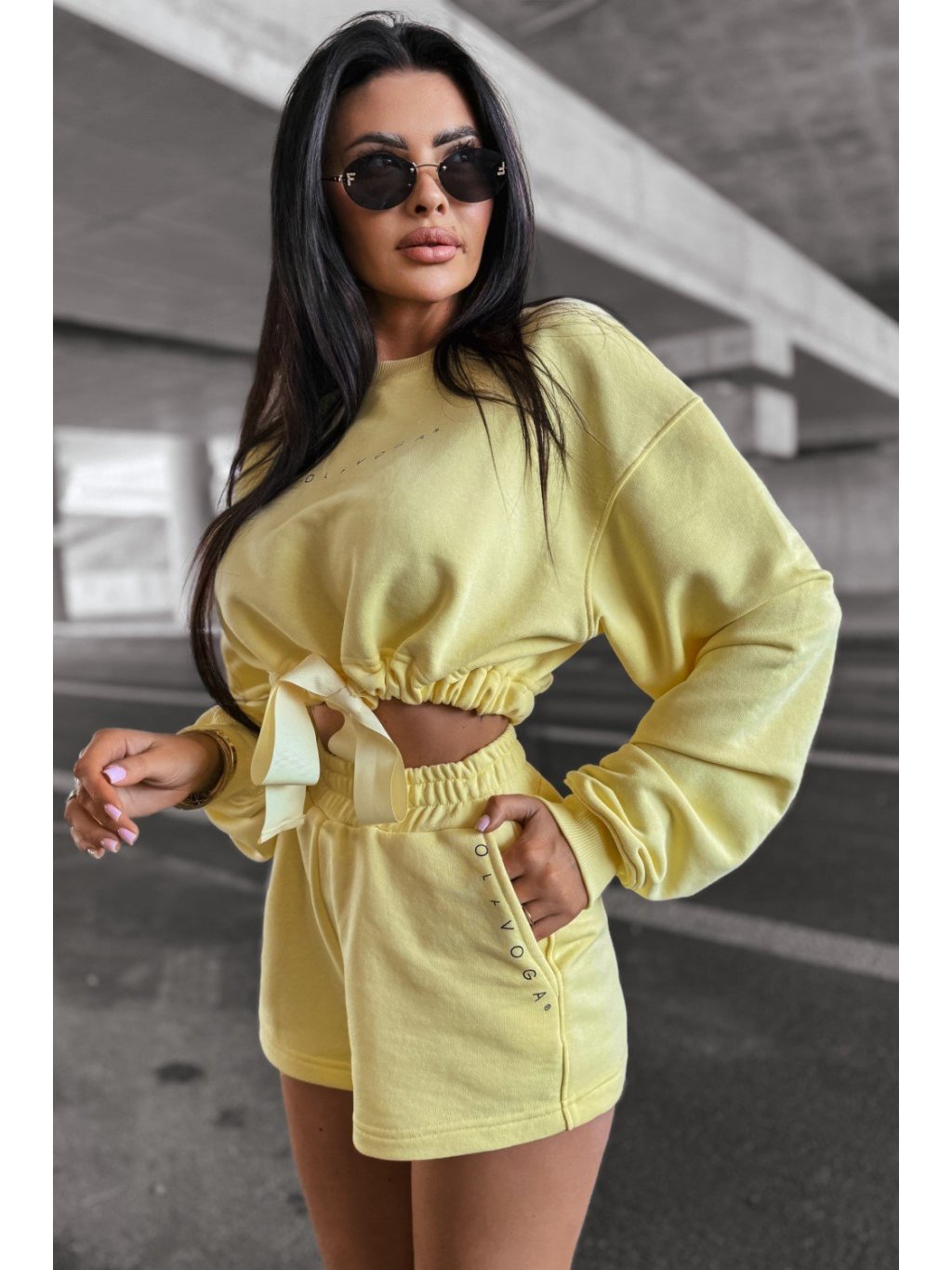 Spodná časť: krátke nohavice s vysokým pásom, s gumou v páse, s logom na prednej strane.