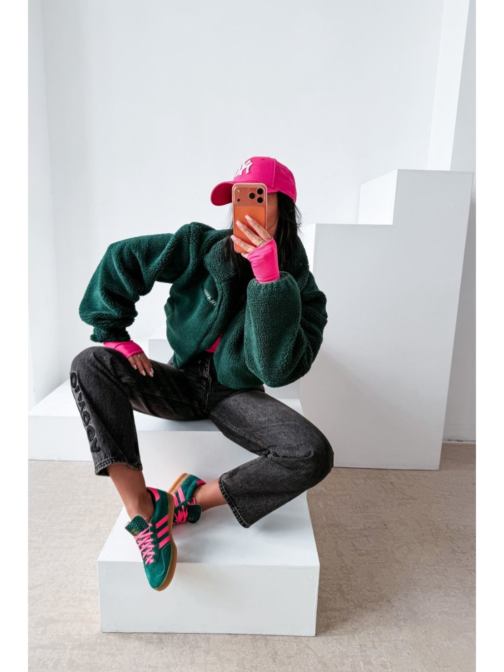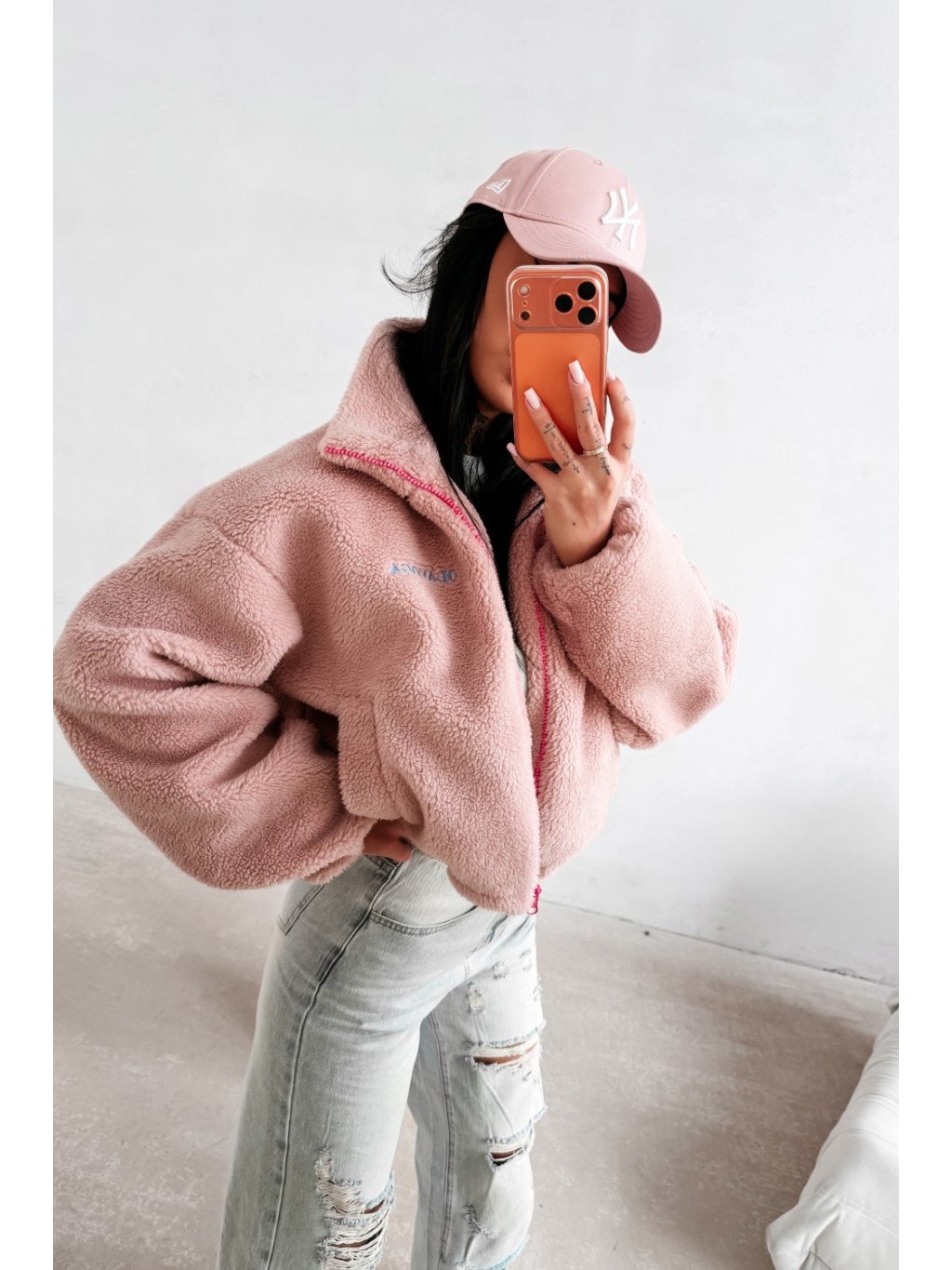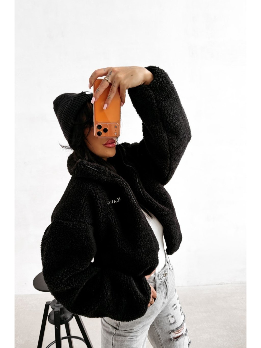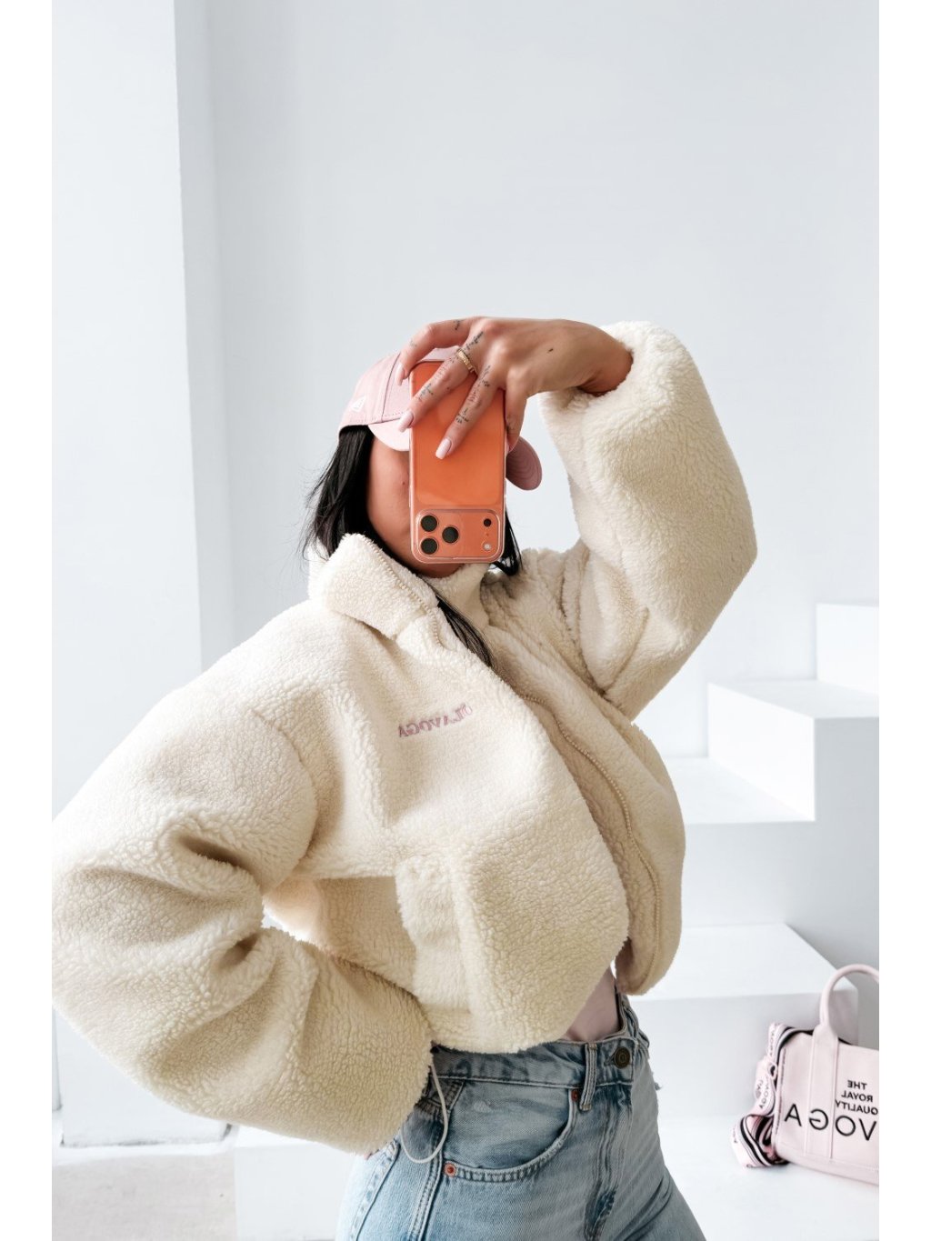 Teddy kabát ležérneho štýlu s vysokým stojačikom a zapínaním na zips. Kabát je vyrobený z mäkkého materiálu so šerpovou štruktúrou s príjemným pocitom, s mierne skráteným strihom a zníženými ramenami. Po stranách má praktické vrecká. Prednú časť zdobí decentné vyšívané logo OLAVOGA, zatiaľ čo zadnú časť zdobí veľkolepá výšivka s veľkým monogramom OLV.