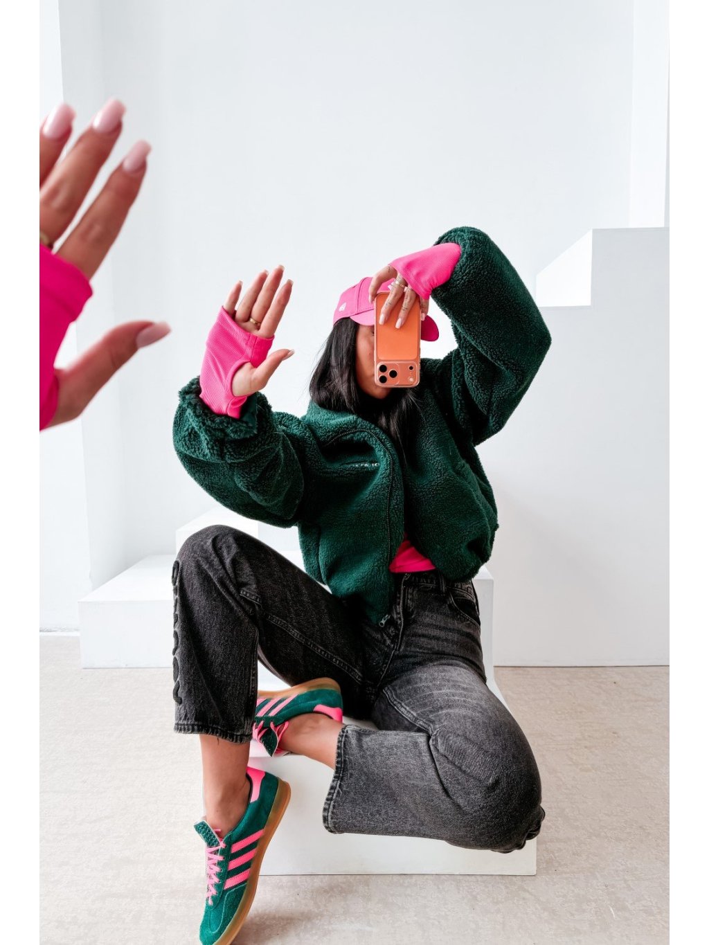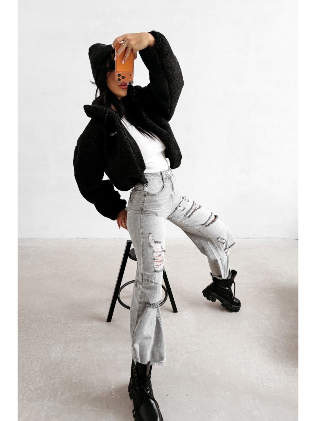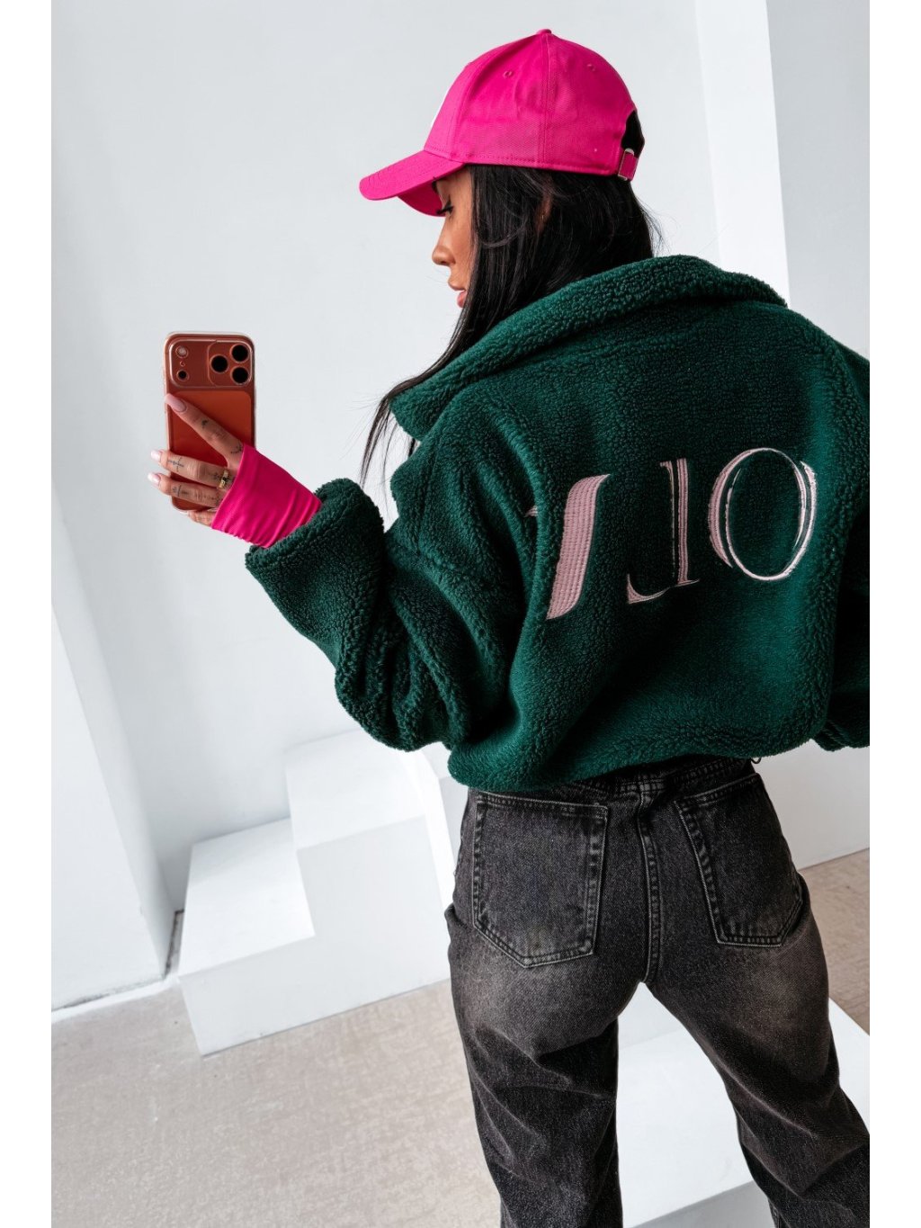 Teddy kabát ležérneho štýlu s vysokým stojačikom a zapínaním na zips. Kabát je vyrobený z mäkkého materiálu so šerpovou štruktúrou s príjemným pocitom, s mierne skráteným strihom a zníženými ramenami. Po stranách má praktické vrecká. Prednú časť zdobí decentné vyšívané logo OLAVOGA, zatiaľ čo zadnú časť zdobí veľkolepá výšivka s veľkým monogramom OLV.