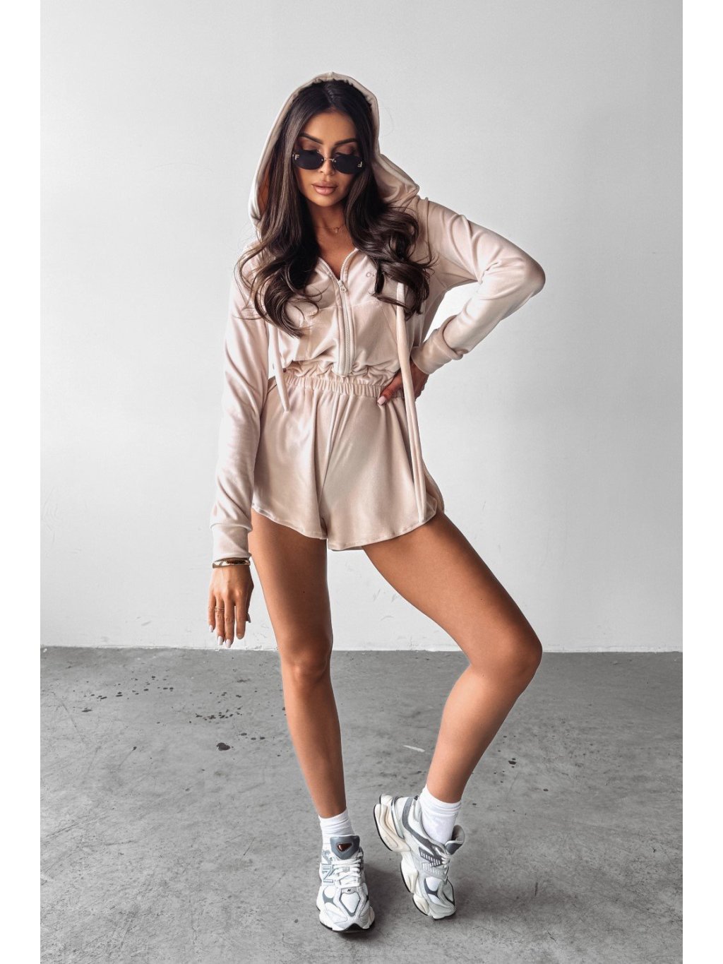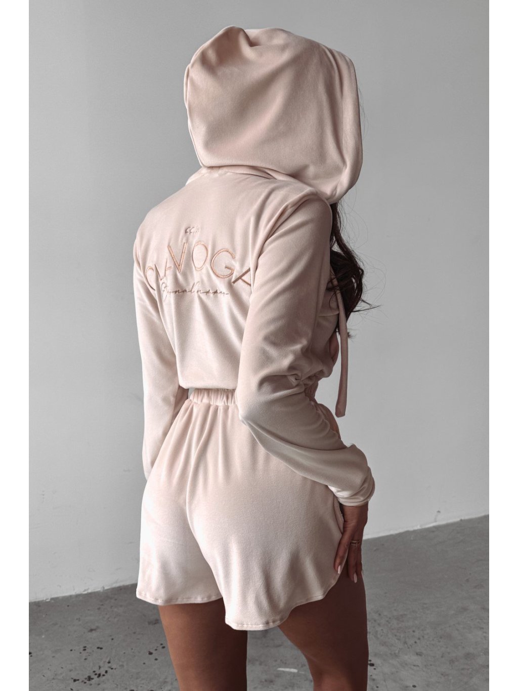 Modelka má výšku 165 cm a nosí veľkosť S. Priliehavý overal vyrobený z mäkkého, elastického, jemne lesklého semišu. Vrchná časť je vyrobená z kapucne a dlhých rukávov a zapína sa na zips vpredu. V páse je vybavený gumičkou. Spodná časť má mierne rozšírené krátke nohavice. Zdobí ho minimalistická výšivka loga OLAVOGA na prednej strane a veľká výšivka značky na zadnej strane.