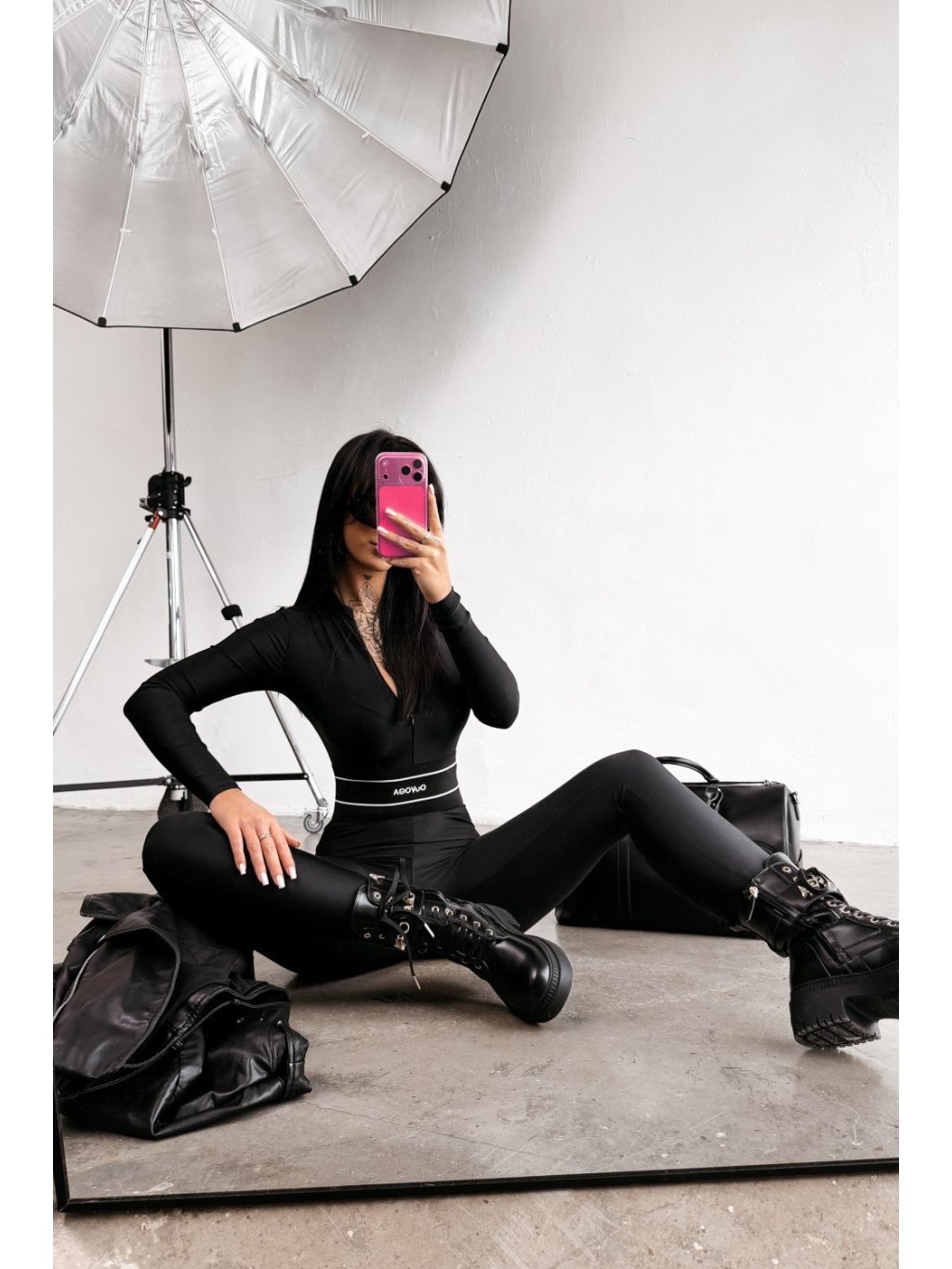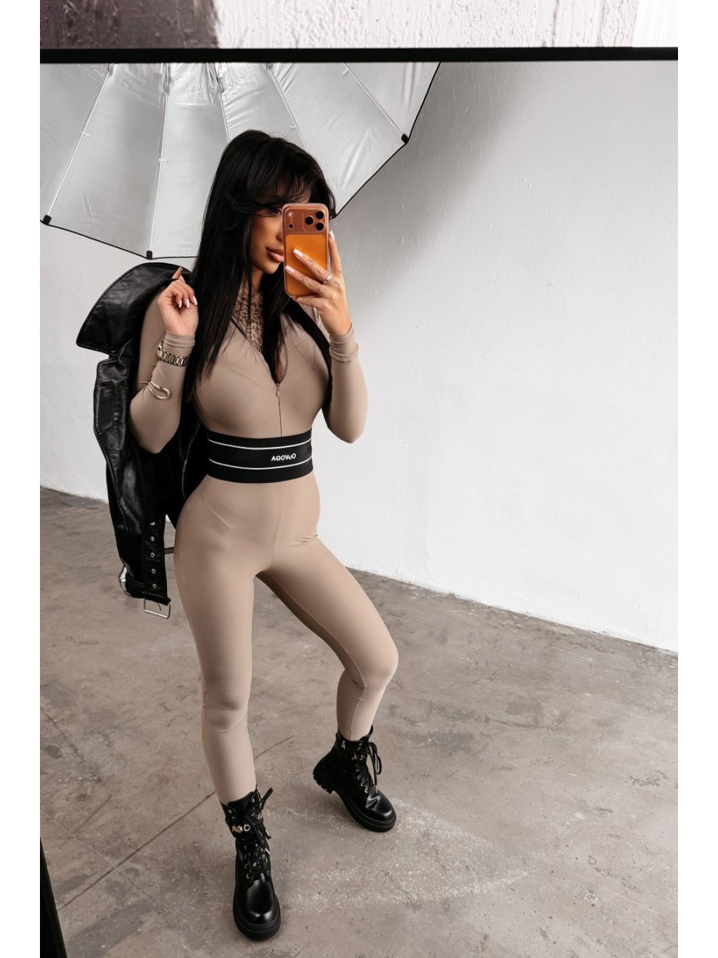 Moderný, priliehavý, vypasovaný overal. Tento elegantný overal s dlhým rukávom je vyrobený z mäkkého, hladkého a elastického materiálu, ktorý dokonale kopíruje kontúry tela. Model s vysokým golierom je vpredu zdobený zipsom, ktorý umožňuje nastavenie výstrihu. Elastický, vyšívaný opasok s logom OLAVOGA s kontrastnými pruhmi v páse zvýrazňuje vypasovanú siluetu.