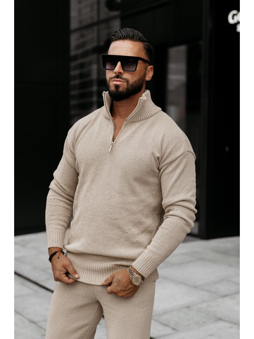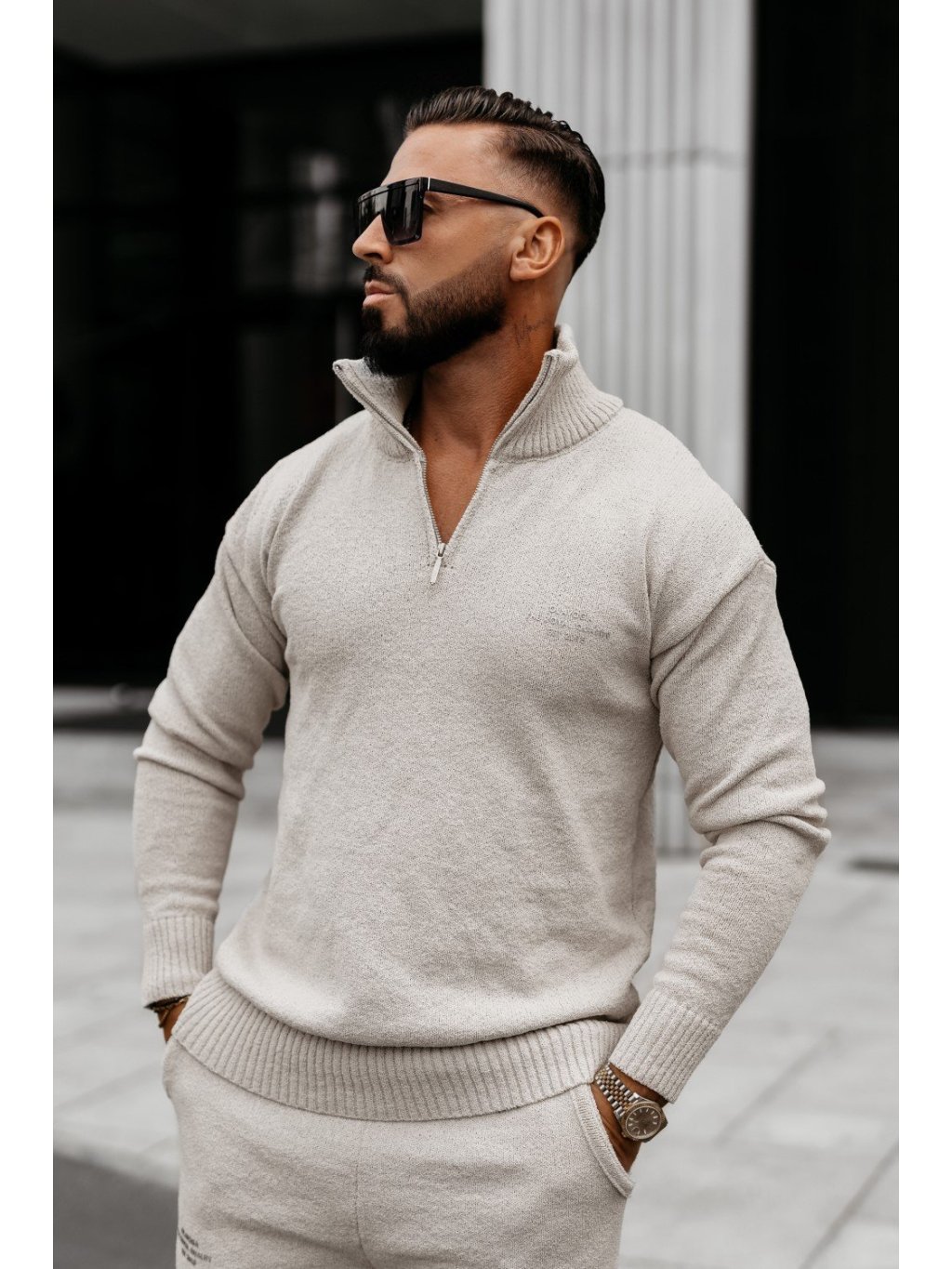 Model má výšku 185 cm a nosí veľkosť L. Pohodlná, ležérna súprava vyrobená z kvalitného pleteného, elastického materiálu. Vrchný diel má vysoký stojačik a krátky zips, so širokým rebrovaným sedlom v spodnej časti. Spodný diel je rovný, s elastickým pásom a decentným vzorom pod vreckom. Celá súprava má čistý, tónovaný vzhľad, doplnený minimalistickým brandingom.