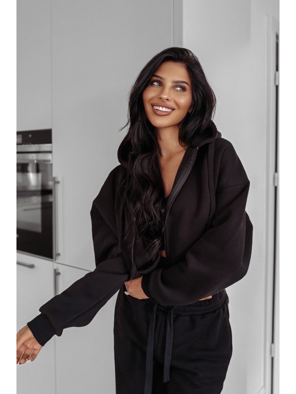Modelka meria 165 cm a má na sebe veľkosť S. Minimalistická mikina s kapucňou vyrobená z mäkkej, príjemnej bavlny na dotyk. Voľný strih so spadnutými ramenami a širokými sťahovacími šnúrkami na kapucni jej dodáva športový a zároveň ženský vzhľad. Model sa zapína na zips a má široké rebrované vsadky v spodnej časti a na koncoch rukávov. Diskrétna etiketa s logom zdobí spodnú časť svetra.Zloženie: 80 % bavlna, 20 % polyester