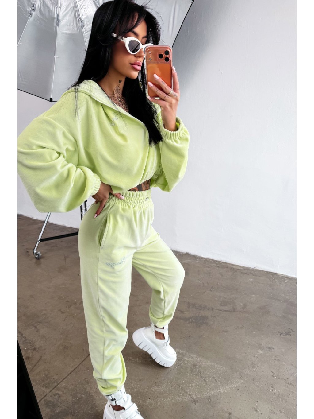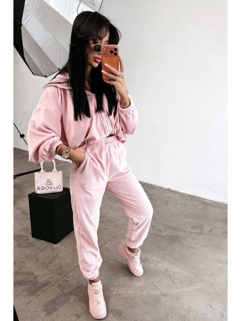 Zamatová tepláková súprava s voľným a priliehavým vzhľadom Súprava vyrobená z kvalitného, mäkkého, na dotyk príjemného semišového materiálu, ktorý je štýlový aj pohodlný zároveň.